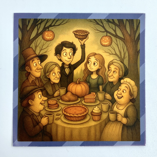 Una casa grande, iluminada por lámparas de aceite, acoge al pueblo entero para celebrar la cosecha. Dentro, hay risas, música y calabazas decorando cada rincón.