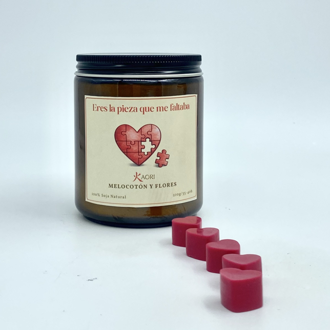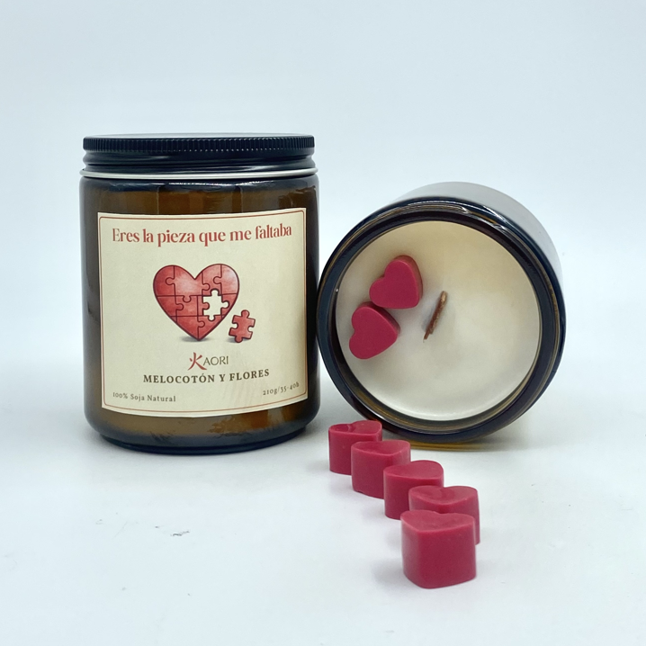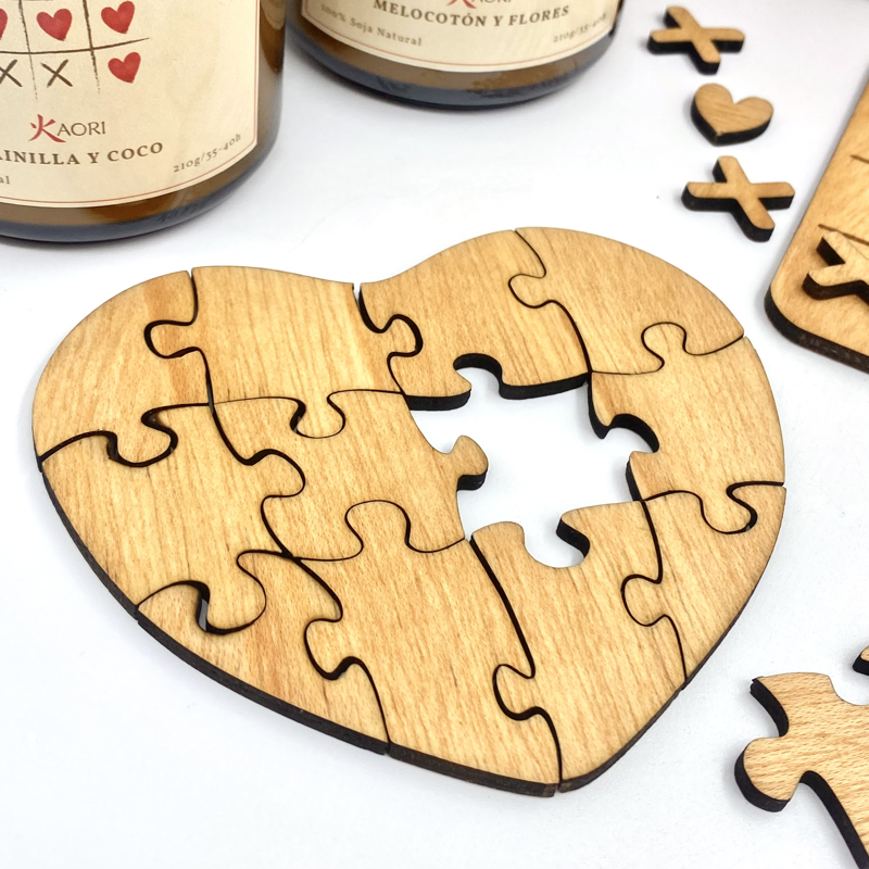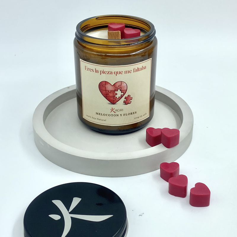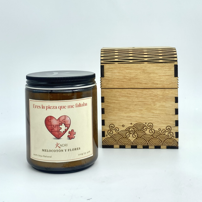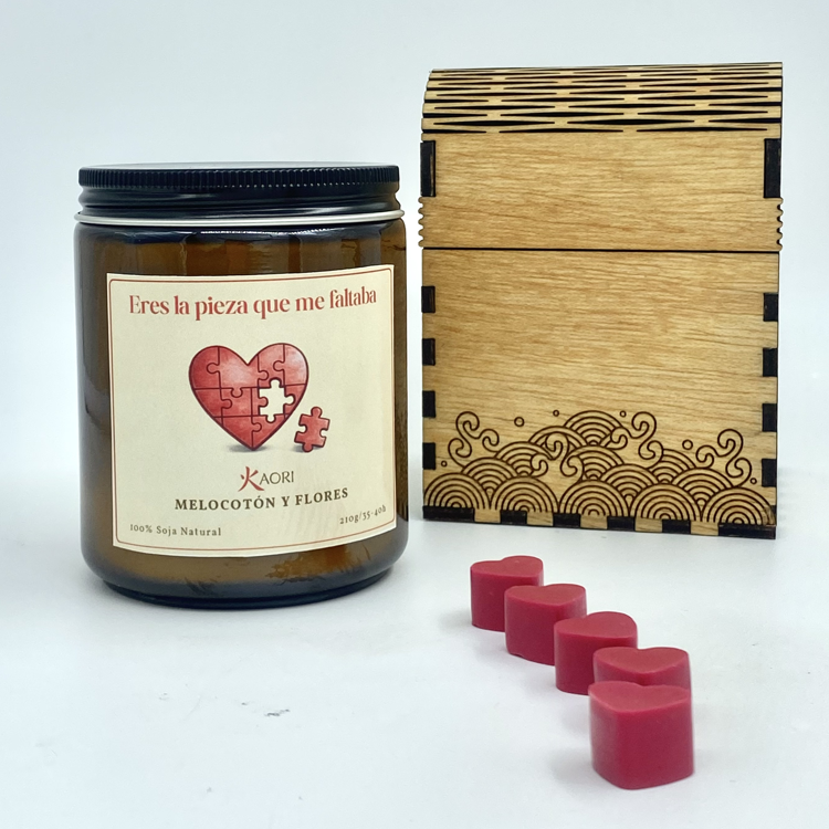 Puedes elegir la vela sola, como todas las velas de Kaori, presentada en su caja de madera; o junto con un puzzle de madera en forma de corazón, pensado como un pequeño símbolo para recordar que hay personas que nos completan.