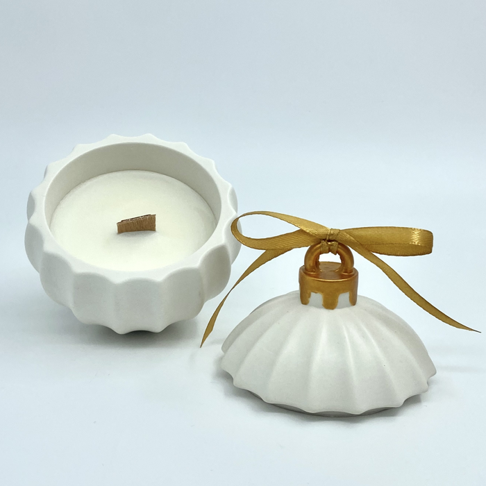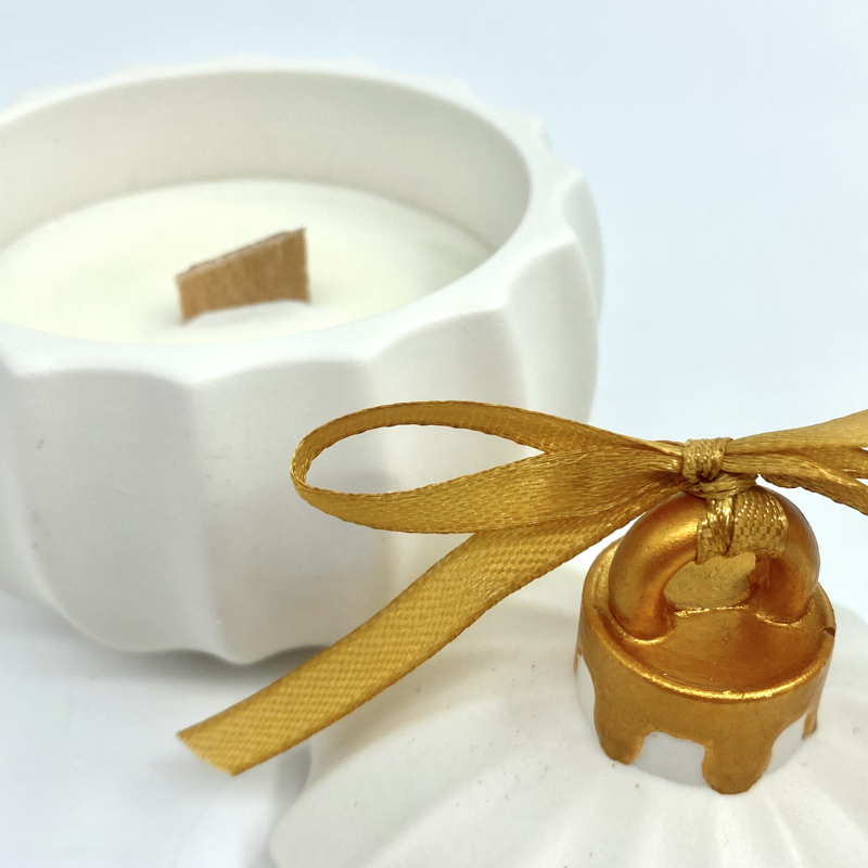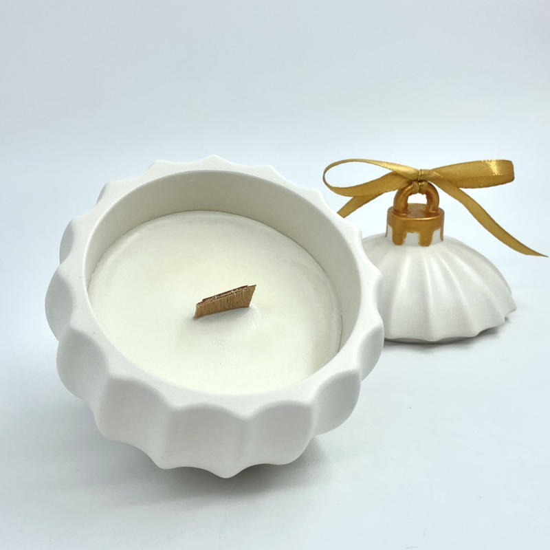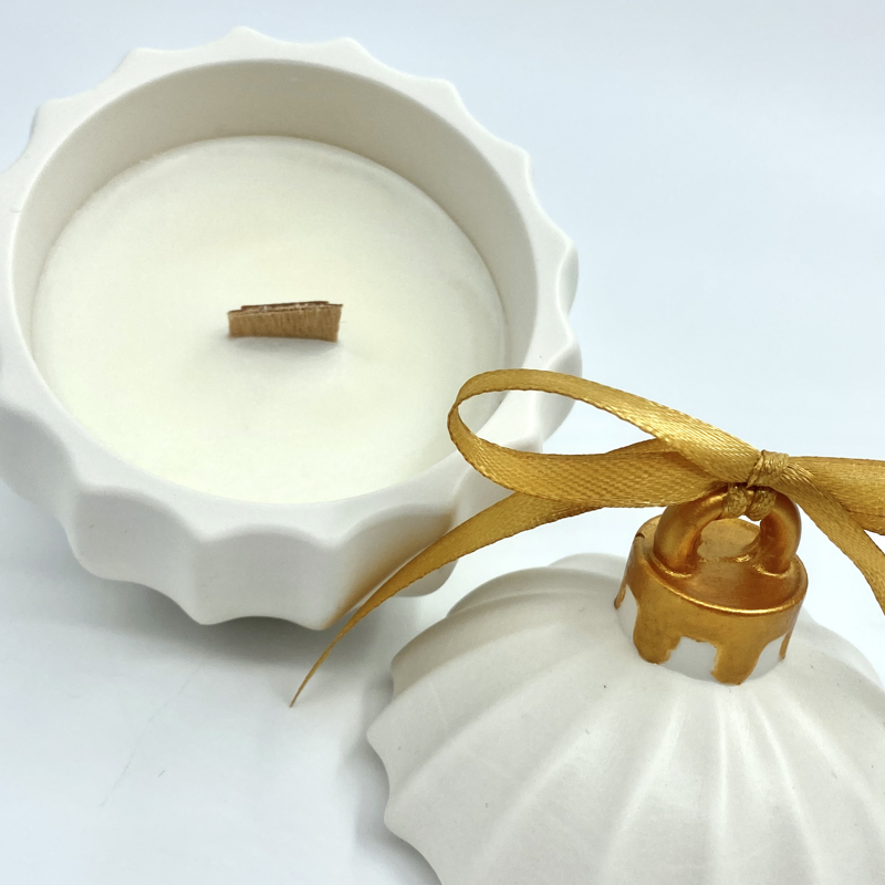 Una vela en recipiente con forma de bola navideña con diseño acanalado, que huele y parece un trocito de Navidad.