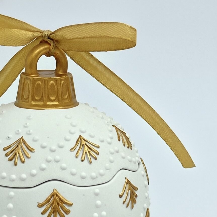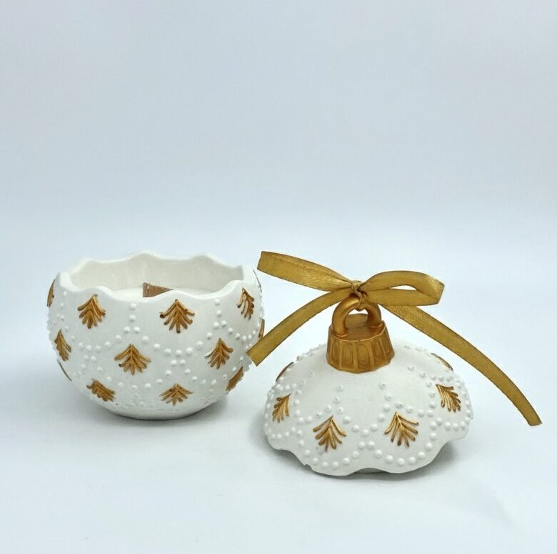 Vela en recipiente con forma de bola navideña, hecha a mano con resina mineral de aspecto cerámico.